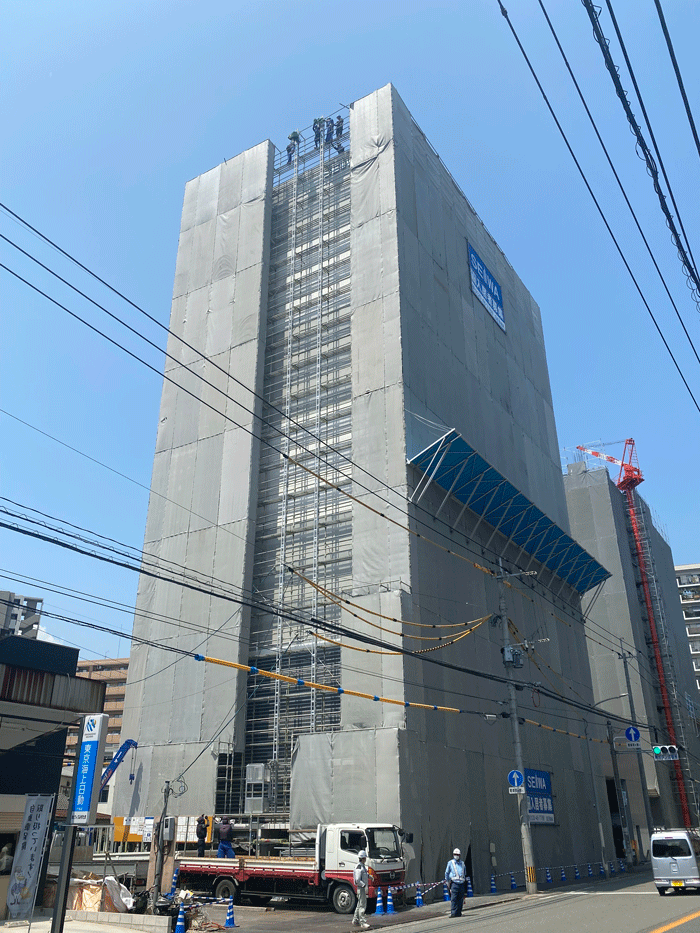 足場工事の中で、最も多く用いられるタイプです。鳥居型の建枠・筋交・ジャッキ・鋼製布板などを組み立てて積み上げる足場であり、強度や耐久性、安全性の高さから、高層建造物における工事に使われることが増えています。